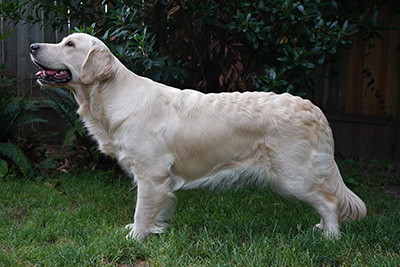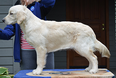 She has a slight wave in her coat,very light golden color, ok pigmentation, nice side movement, she has very nice bone and could use a bit more coat at this time. I love her head!